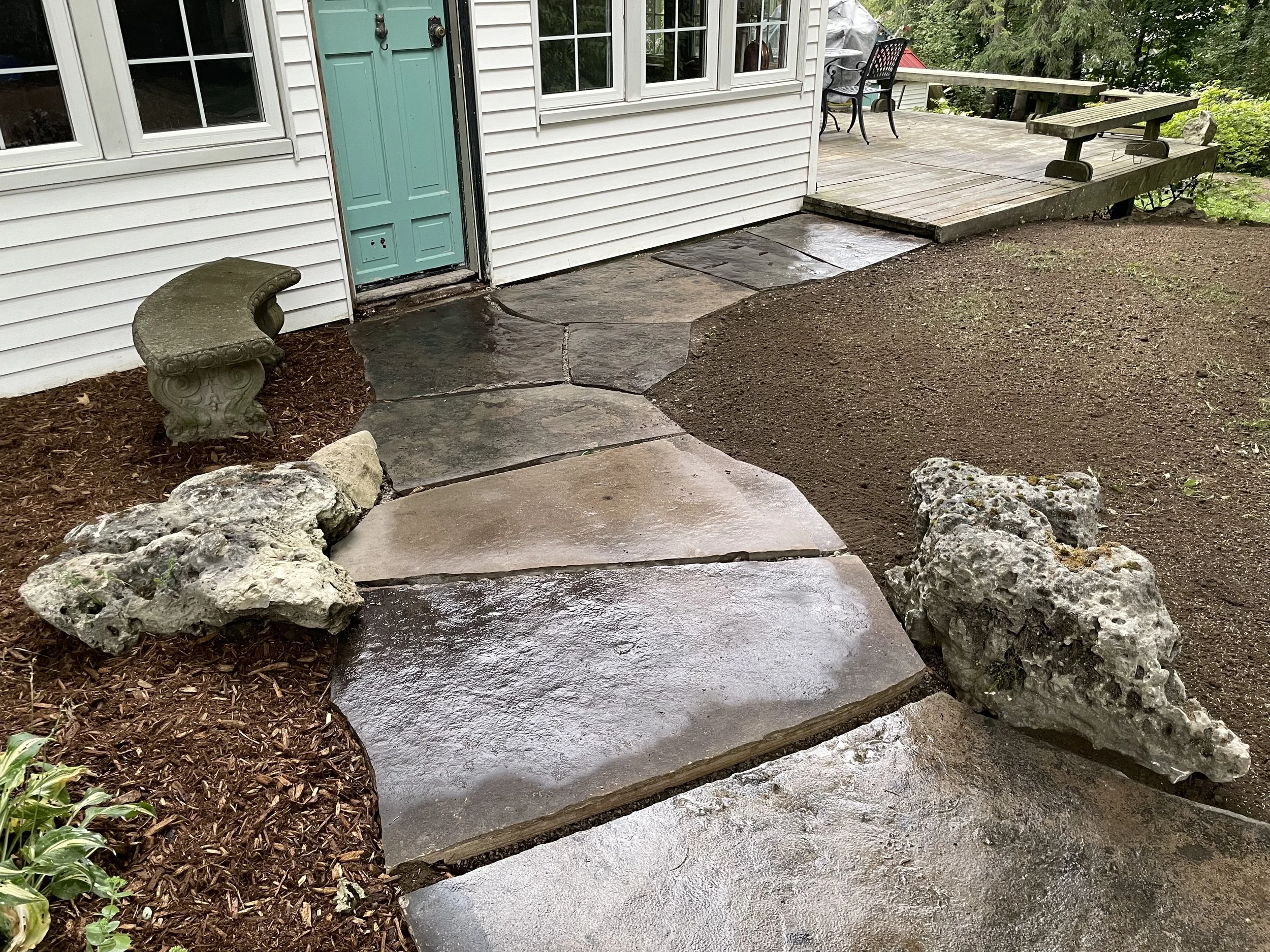 The House on Periwinkle Lane had an old patio that was falling apart. We took up each stone by hand, installed a packed gravel base then re-layed the patio mixing the old stone in with new pieces. Each stone was cut to fit perfectly with no more than 3 corners touching and levelling was checked over and over to ensure proper runoff and a smooth finish.