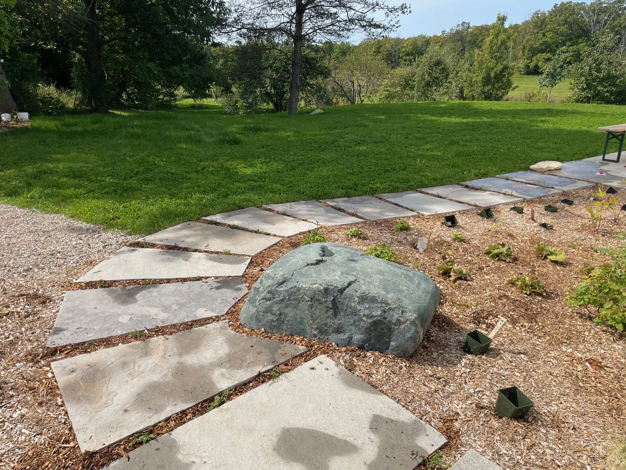 The row of limestone boulders represents the Niagara Escarpment running north south with a stunning green tinted granite ‘glacial erratic’ boulder in the centre all surrounded by chip stone that can be raked into flowing patters.